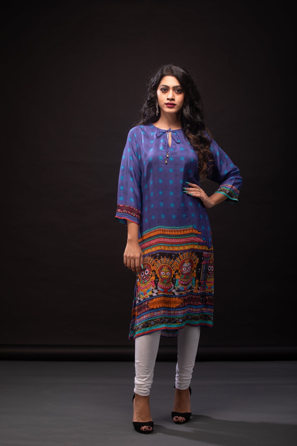 Showcase your classic charm and unique style with The Celestial Odissi Pattachitra tunic! This outfit is timeless in its design and can be elevated through the use of , wedges or mules and accessories.