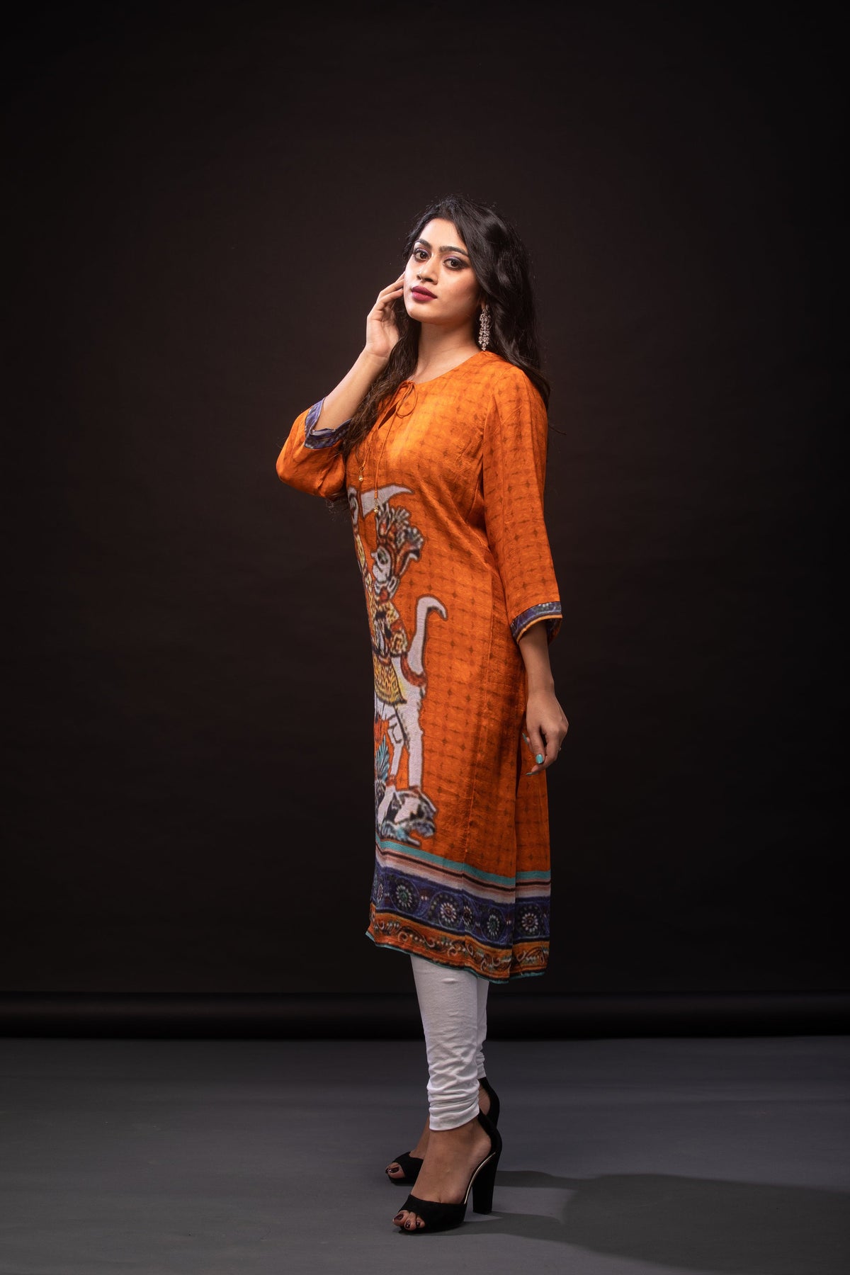 Its exquisite combination of orange and blue is enriched with exquisite placement of the Avatars of lord Vishnu. The eye-catching orange frame is surrounded by a stunning floral pattern adding charm to your ensemble. Be a part of divine celebration with this heavenly dress!