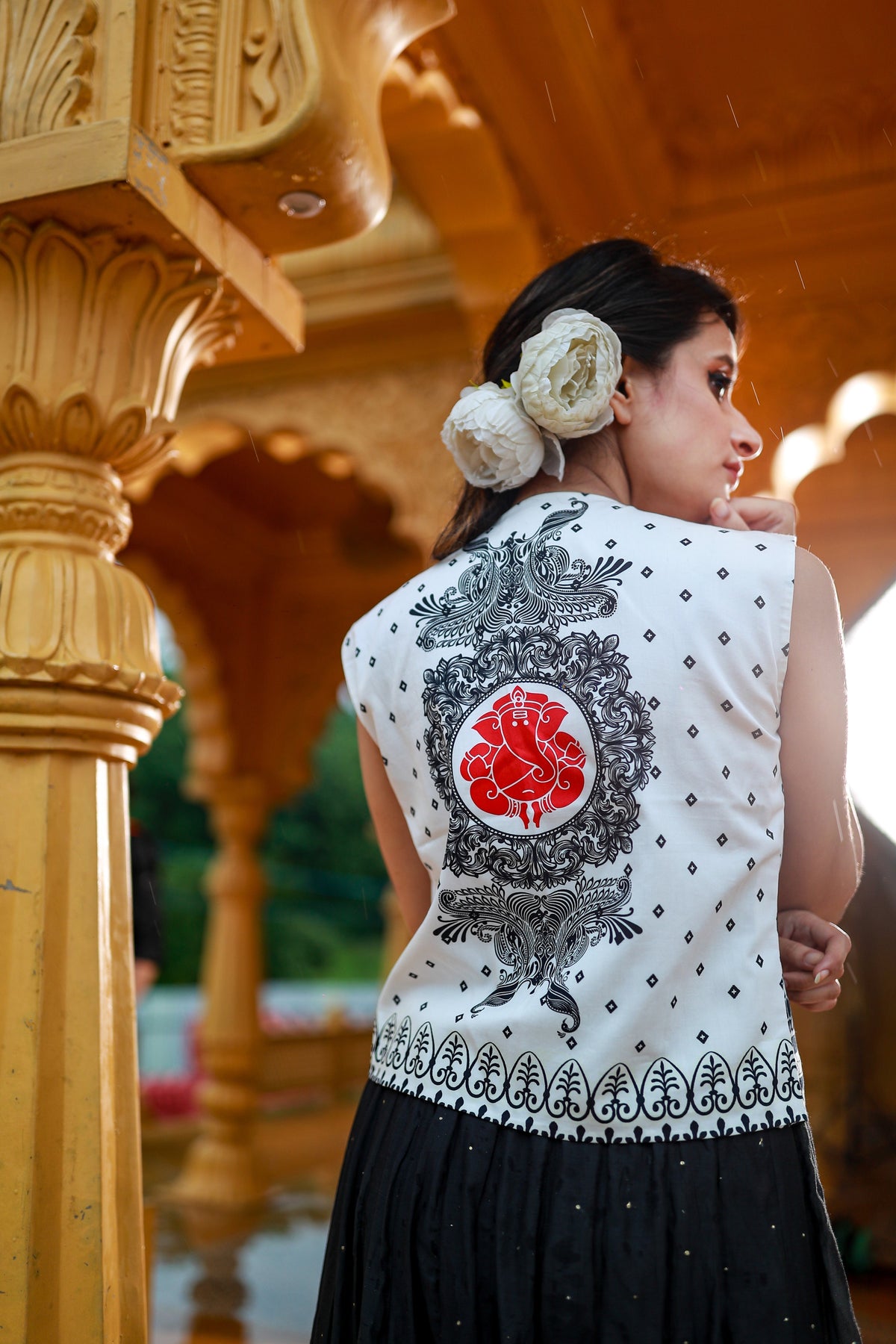 Wear a piece of our Indian history through this polished Black & White Cotton Satin Jacket. The Bold Red Ganpati print on the back is surrounded with an intricate Black design. The designs across this Bundi Jacket are precisely placed to display elegance and finesse