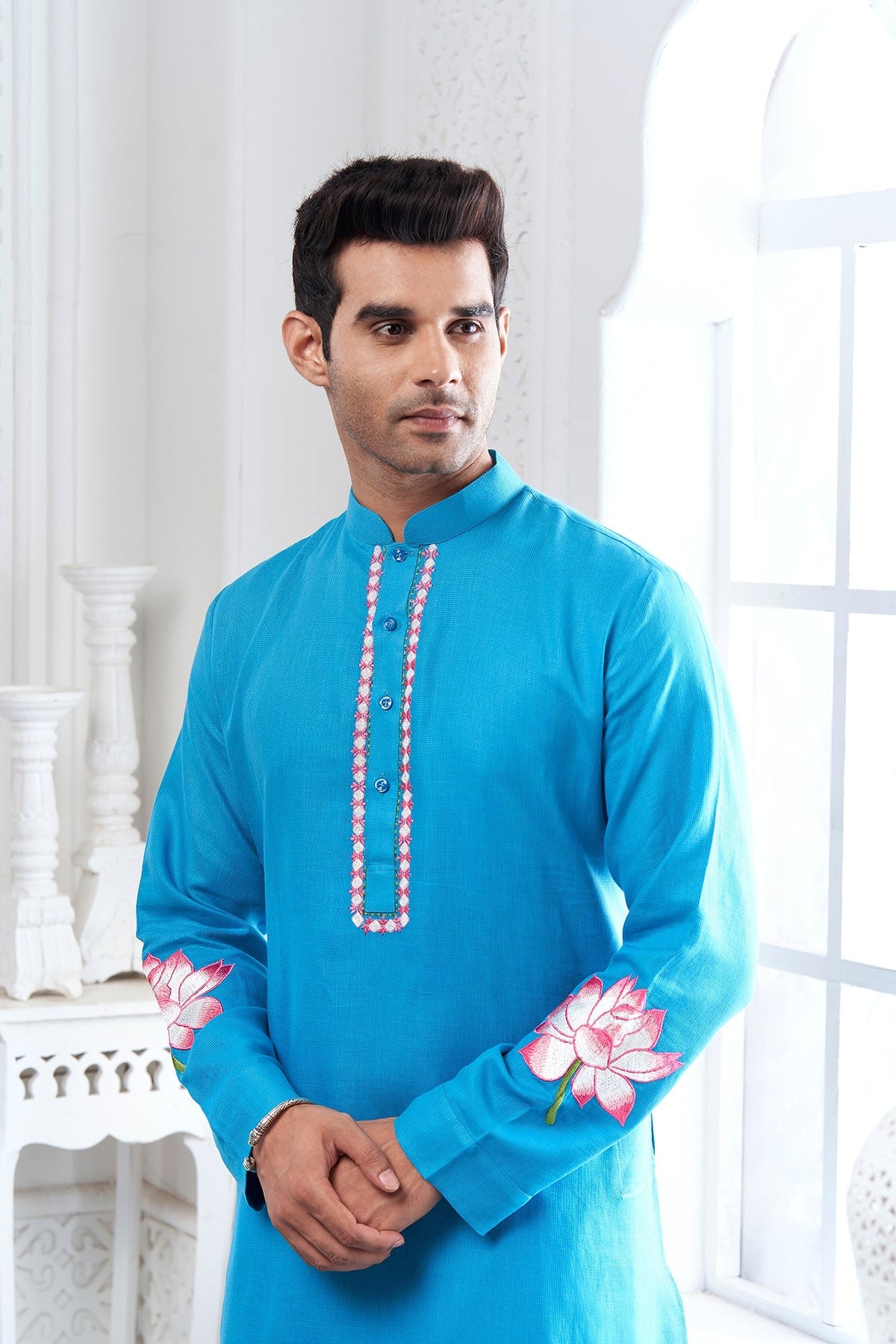 Featuring a unique lotus design in a captivating light blue colour, you'll be sure to turn heads with this original piece. Embroidered with an exquisite lotus design on the sleeve, and an intricate lotus design on the placket of the Kurta, you will love to celebrate in style! The Kurta is perfect for adding a spiritual touch to your wardrobe.
