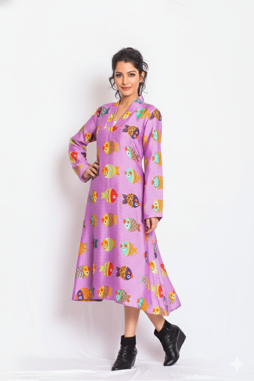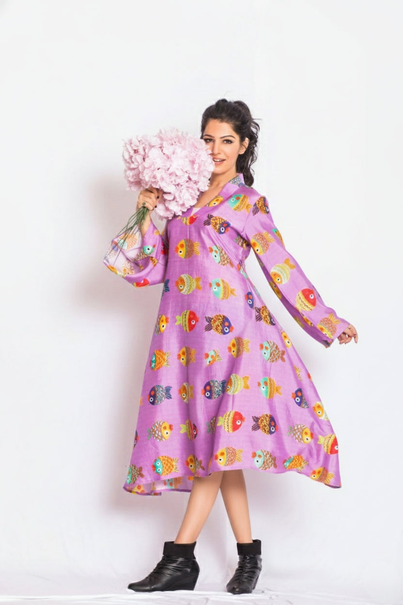 Prati is a long, flowing lavender dress with full sleeves, a collar neckline, and colourful fish print all over the dress. The neckline, sleeves, and collar are a perfect combination of drapey and fitted. Its comfortable lines and simple silhouette make it easy to throw on and run out the door.