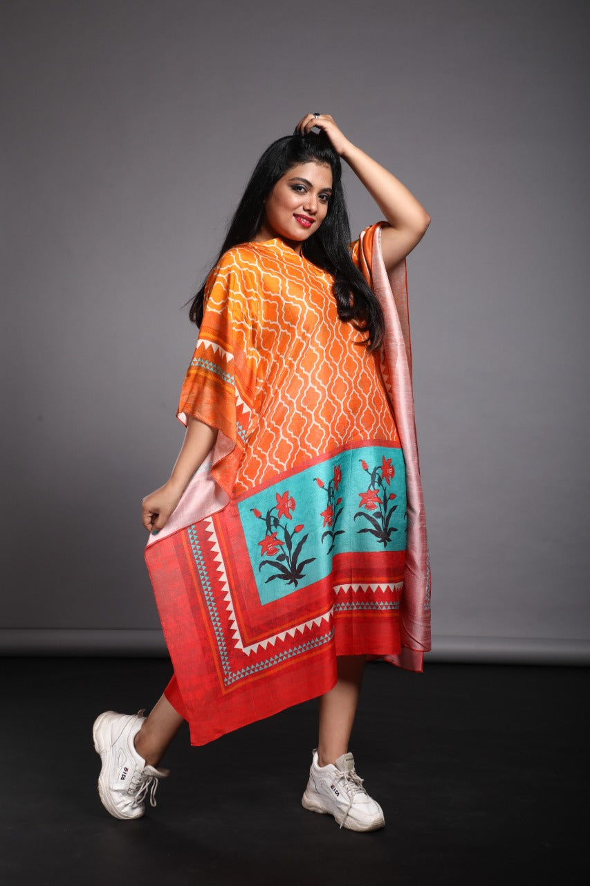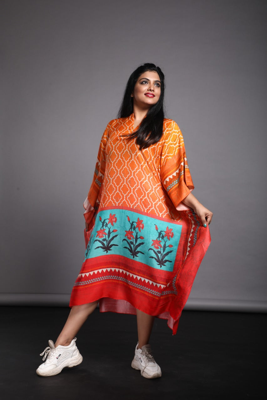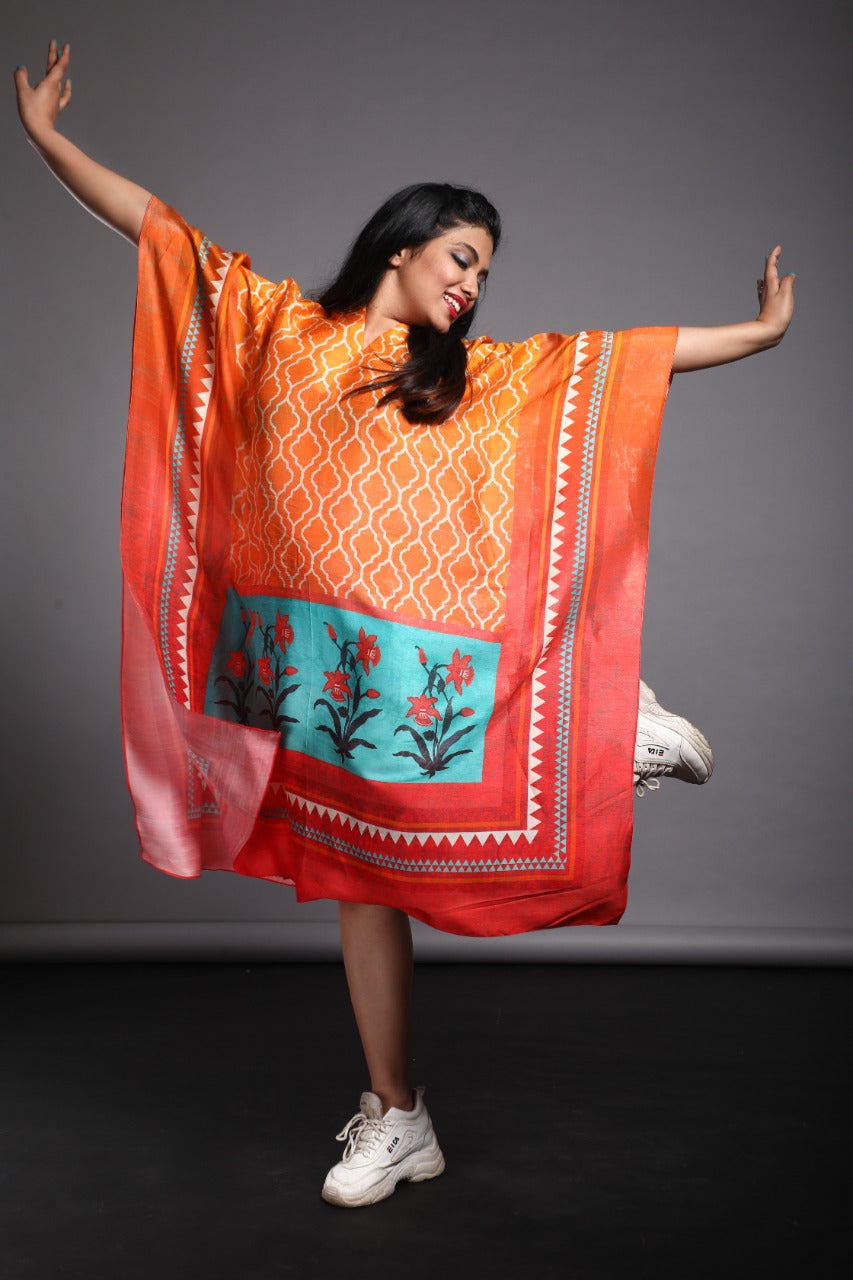 Diya is a long, flowing orange toned kaftan with three-quarter sleeves, a collar neckline, and an elegant design exclusively made by the House of Deepthi team. The neckline, sleeves, and collar are a perfect combination of drapey and fitted. Its comfortable lines and simple silhouette make it easy to throw on and run out the door.